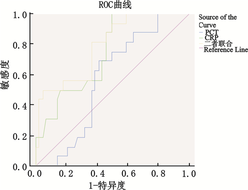 | 图 1 PCT、CRP区分革兰阳性菌和真菌血流感染ROC曲线 Fig 1 The ROC curve of PCT and CRP for diagnosis sepsis due to gram-positive bacteria or fungal bloodstream infection |