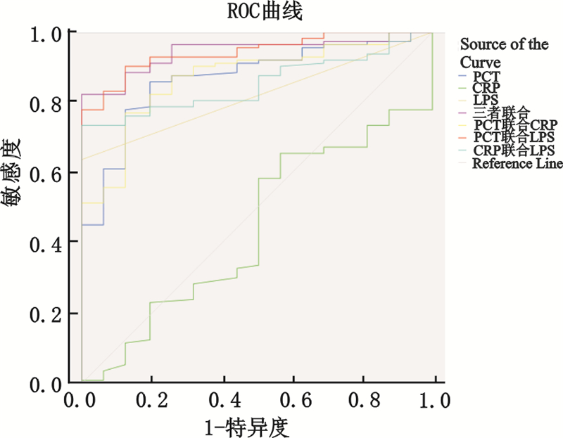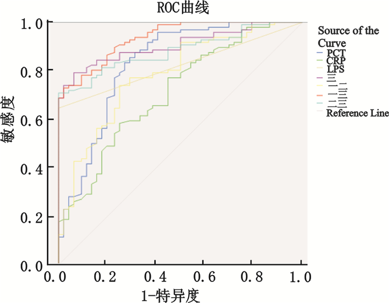 PCT曲线下面积(AUC)最大值为0.826,在ROC 曲线上敏感度、特异度均较高的临界点为2.68 ng/mL,以PCT质量浓度>2.68 ng/mL作为除外革兰阳性菌、考虑革兰阴性菌的临界点具有一定临床价值。CRP曲线下面积(AUC)最大值为0.707,在ROC 曲线上敏感度、特异度均较高的临界点为106.5 mg/L,以CRP质量浓度>106.5 mg/L作为除外革兰阳性菌、考虑革兰阴性菌的临界点具有一定临床价值。LPS阳性作为除外革兰阳性菌、考虑革兰阴性菌的诊断依据具有较明确的临床价值。联合使用PCT、CRP和内毒素的AUC最大值为0.902,其敏感度74.2%,特异度97.7%,这对两者的鉴别诊断更具有重要的意义。见图 3。