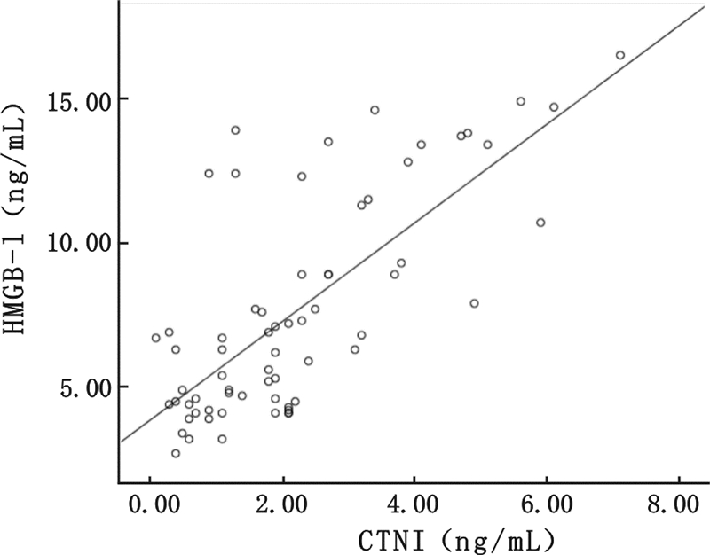 | 图 1 血HMGB-l和cTNI质量浓度散点图 |