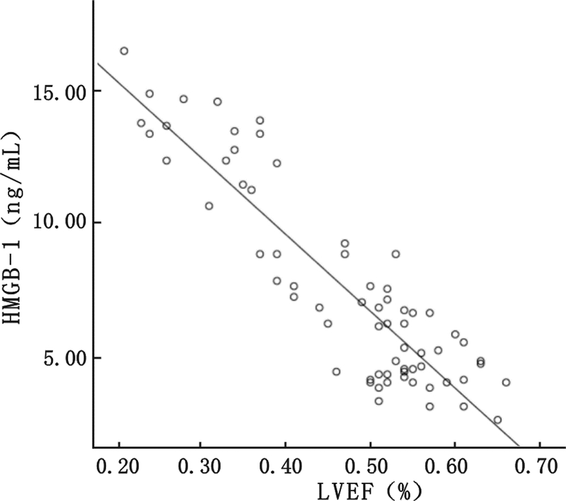 | 图 2 血HMGB-l质量浓度和LVEF散点图 |