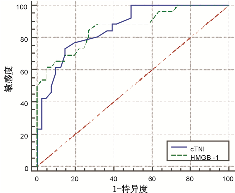 血HMGB-1的AUC是0.863(95%CI: 0.757~0.935;P < 0.05),最佳截点是6.3 ng/mL;血cTnI浓度预测的AUC是0.864(95%CI: 0.759~0.936; P < 0.01),最佳截点是2.1 ng/mL,AUC差异无统计学意义(P=0.428),见图 3。