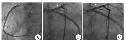 | A:右冠状动脉;B:前降支夹层;C:前降支支架植入后 图 1 例6 患者血管造影及PCI术后造影图 |