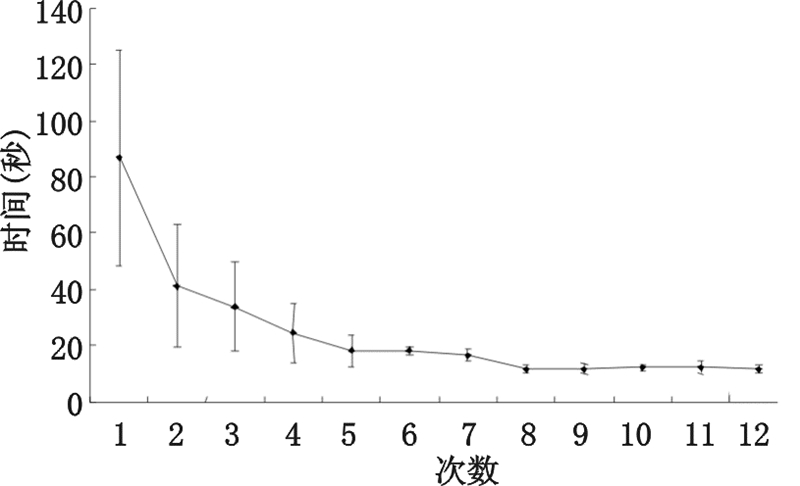 在12次的操作中,成功率变化趋势如图 2,第1~7次相邻3次成功率差异具有统计学意义,至第8次之后相邻3次操作成功率差异没有统计学意义。根据本研究的界定,第8次插管之后操作时间达到稳定状态,见表 3。
