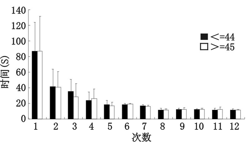 根据参训者年龄分为≤44岁和≥45岁两组,二者在12次操作中所用时间的差异无统计学意义(图 3,表 4)。