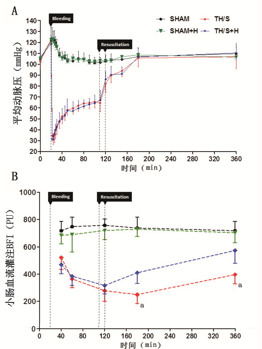 | A:T/HS大鼠MAP的动态变化 模型开始20 min快速放血后MAP快速下降;110 min后开始进行液体复苏(维持10 min)后T/HS大鼠MAP可逐渐恢复正常,氢化可的松未现明显疗效。B:T/HS大鼠BFI动态变化 液体复苏后60 min(180 min)小肠BFI降至最低,360 min亦未能恢复正常;氢化可的松具有明显疗效。T/HS组与T/HS+H组比较,aP<0.05 图 1创伤休克大鼠MAP及BFI监测 Fig 1 Monitoring of MAP and intestinal perfusion in T/HS rats |