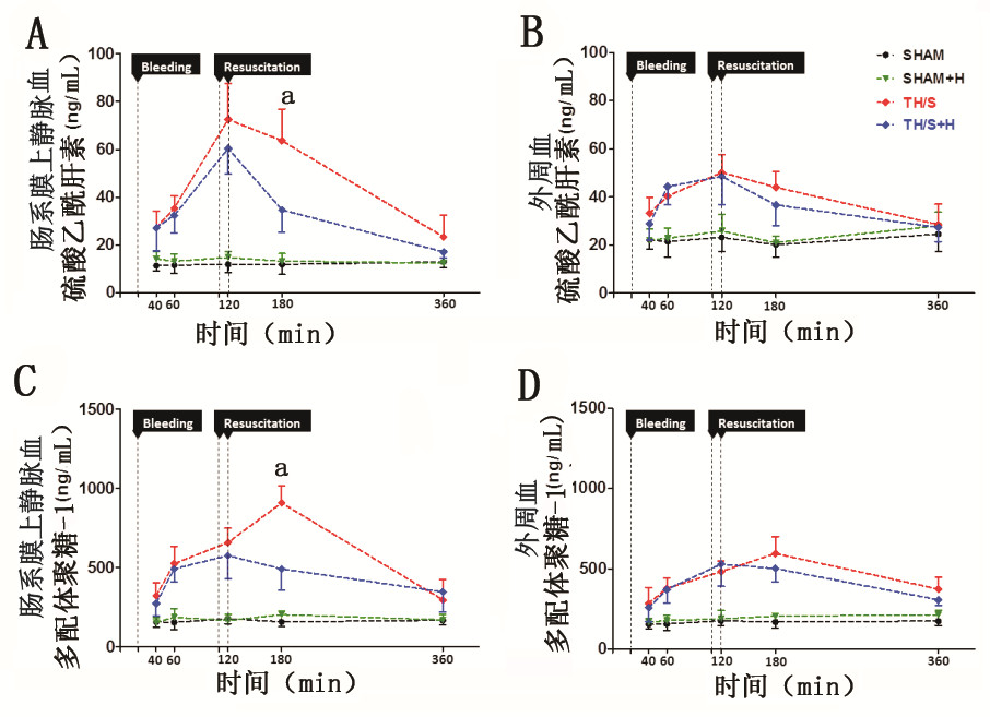 | A:各组大鼠肠系膜上静脉硫酸乙酰肝素质量浓度变化趋势;B:各组大鼠外周血硫酸乙酰肝素质量浓度变化趋势;C:各组大鼠肠系膜上静脉多配体聚糖-1质量浓度变化趋势;D 各组大鼠外周血多配体聚糖-1质量浓度变化趋势。T/HS组与T/HS+H组比较,aP<0.05 图 3 创伤休克大鼠SMV及外周血中糖萼成分的动态改变 Fig 3 Serum levels of glycocalyx components in the SMV and peripheral blood |