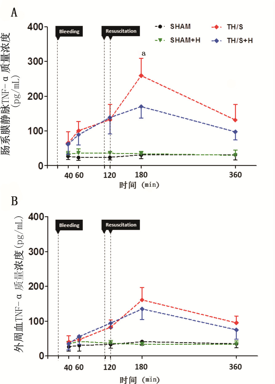 | A:各组大鼠肠系膜上静脉TNF-α质量浓度变化趋势;B:各组大鼠外周血TNF-α质量浓度变化趋势;T/HS组与T/HS+H组比较,aP<0.05 图 4 T/HS大鼠SMV及外周血中TNF-α质量浓度的动态改变 Fig 4 Serum levels of TNF-α in the SMV and peripheral blood |