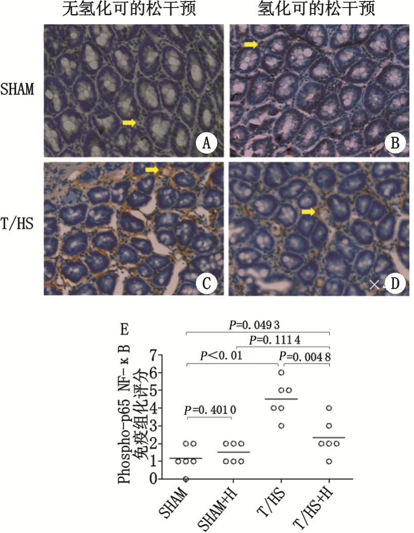 TNF-α在小肠微循环及内皮细胞的局部微环境中的含量增加可能参与了糖萼的结构破坏的发生机制。发现T/HS发生后20 min大鼠SMV血中TNF-α质量浓度即出现明显的升高(图 4A),且其较高质量浓度维持的时间较长(约3 h),而外周血TNF-α质量浓度的峰值明显低于SMV血(图 4B)。相对于SHAM组及SHAM+H组(图 5A、B)大鼠,T/HS发生后360 min后小肠血管内皮出现NF-κB的高表达(图 5C),它可能是小肠TNF-α大量分泌进而诱导内皮糖萼降解的可能机制之一。氢化可的松能够降低SMV中TNF-α的质量浓度(图 4A),同时明显降低NF-κB的表达(图 5D、E),其可能为糖皮质激素对T/HS大鼠小肠内皮糖萼具有保护作用的潜在机制。