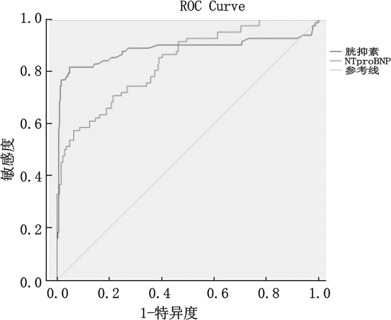 血浆氨基末端B型利钠肽前体(NT-proBNP)是由B型利钠肽前体(proBNP)分解而来的,与B型利钠肽(BNP)呈等摩尔进入血液,其浓度主要是合成水平上的调节[8],半衰期较BNP长,且仅通过肾脏排泄,因此血浆浓度高、稳定[9],临床上可通过测定血浆NT-proBNP的浓度变化来反映BNP的变化,因此NT-proBNP在临床上公认是心力衰竭临床诊断上近几年的一个重大进展[10, 11]。很多研究都已证实[12],BNP和NT-proBNP在慢性肾脏病患者中拥有相同的作用,肾损伤患者体内的BNP和NT-proBNP会因为肾小球滤过率下降而在体内蓄积,尤其是NT-proBNP,因此NT-proBNP对心衰及肾功能不全均有诊断价值,目前争议的焦点在于NT-proBNP浓度的升高是由患者本身心衰引起的还是由于肾脏清除能力下降造成的。胱抑素C是半胱氨酸蛋白酶抑制蛋白之一,广泛分布于人体的各种体液中,能在几乎所有的有核细胞内以恒定速度持续地转录与表达,仅通过肾排泄,它能自由地通过肾小球滤过膜,并在近曲小管几乎完全被重吸收,不再重新回到血液循环中,同时,肾小管也不分泌Cys-C,其血浆浓度不受年龄、性别、饮食、体质量、炎症、肌肉量等的影响,故CysC能灵敏地反映肾小球滤过率(glomerular filtration rate,GFR)的变化,与血清肌酐值相比能更早地对肾脏损伤做出精确的诊断[5, 13]。因此,本研究将NT-proBNP及Cys-C应用于1型CRS的早期诊断,以了解它们在1型CRS早期诊断上的价值。