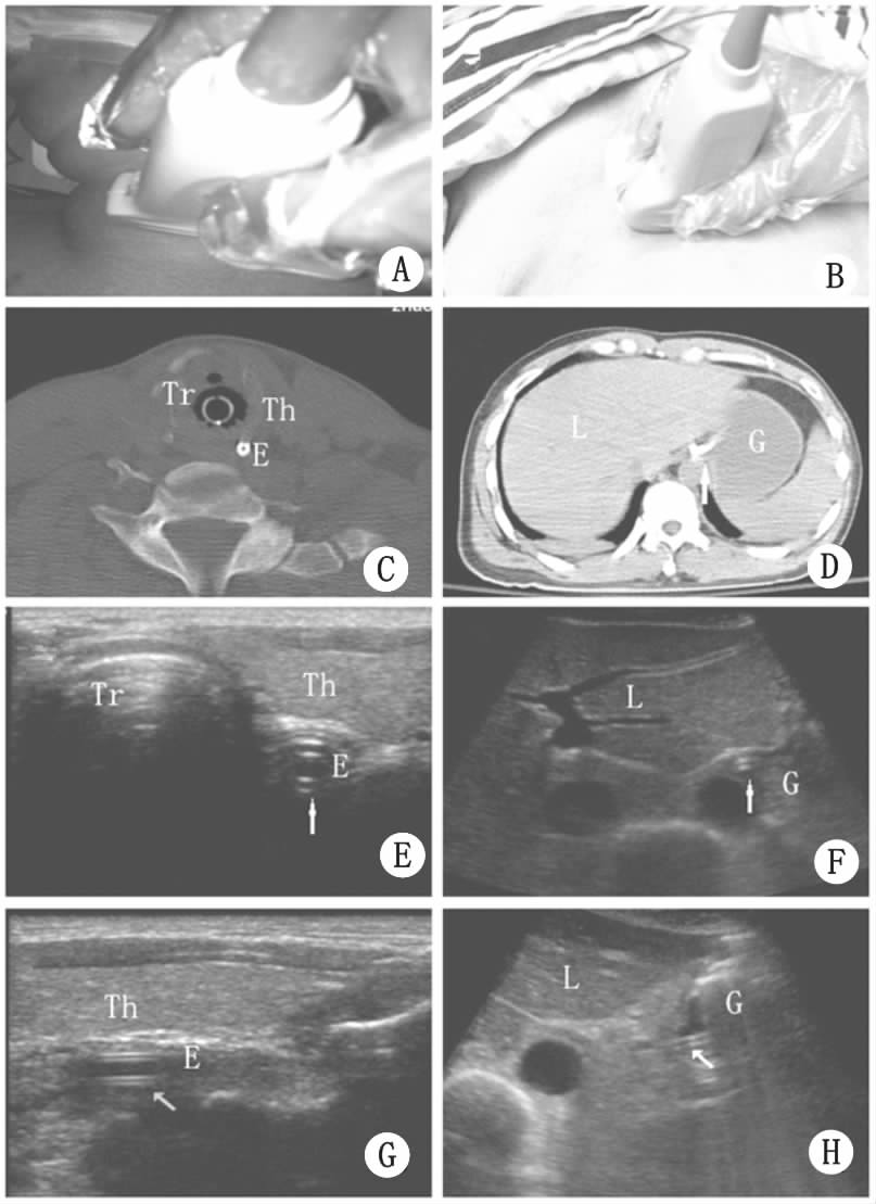 A:颈部超声扫查时探头的位置;B:腹部超声扫查时探头的体表位置;C:颈部的CT截面图,可见食道位于甲状腺左叶后内侧、气管左后方,食道内高密度亮点为鼻饲管;D:上腹部CT的截面图,贲门位于肝左叶后方、腹主动脉前方,贲门内高密度亮点为鼻饲管;E、G:颈部食道内的超声横截面和纵切图;F、H:胃贲门/胃体内鼻饲管超声图,受胃内气体干扰的鼻饲管只能部分显像。(Tr 气管;Th 甲状腺;E 食道;L 肝;G 胃) 图 1超声确定鼻饲管位置的方法