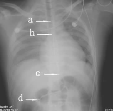 a:鼻饲管避开支气管轮廓沿食道方向下行;b:鼻饲管跨越气管隆突或支气管影像一直向下穿行;c:鼻饲管在身体中线位置穿越横膈进入膈下;d:在横膈下方鼻饲管末端清晰可见 图 2X线确定鼻饲管位置的方法