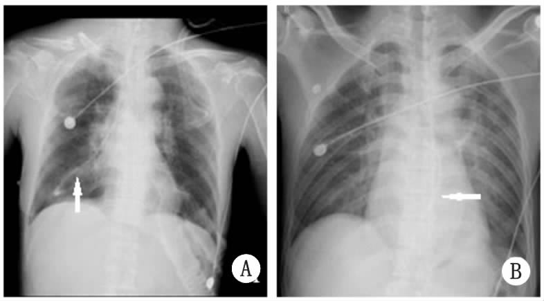 A:右下支气管内见鼻饲管影像,B:鼻饲管食道内折返 图 3鼻饲管异位的X线表现