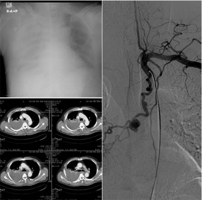支气管动脉瘤诊断主要依靠CTA、DSA、MRA等手段[3, 4]。查体可发现因血胸导致患侧肺呼吸音减低;胸片可见单侧胸腔积液和纵膈增宽;平扫胸部CT能显示后纵膈团块样高密度影及一侧胸腔大量积液;进一步增强CT或CTA检查可发现纵膈结节状强化影或造影剂外渗及异常小血管影。本病例根据出血部位看,支气管动脉破裂虽然发病率不高,但要高度怀疑,尤其是CT提示局部可见小血管影。当然,食管的营养血管病变也有可能。主动脉壁间血肿或主动脉溃疡所致的纵膈血肿或出血,病变往往紧贴胸主动脉,CTA检查有助于鉴别。