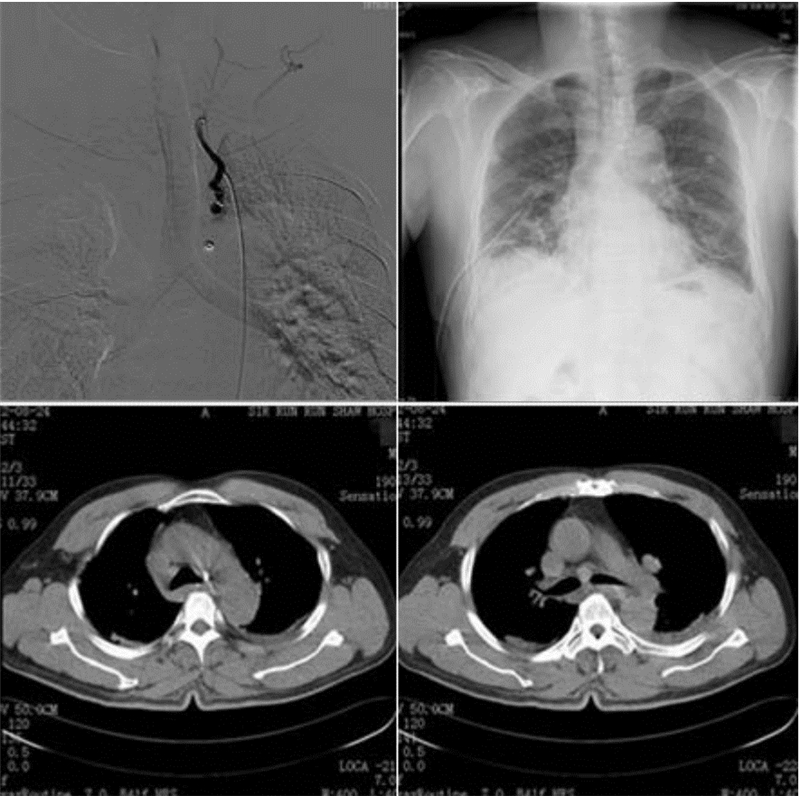 | 图 1 术前胸片、胸部增强CT及术中造影检查 |