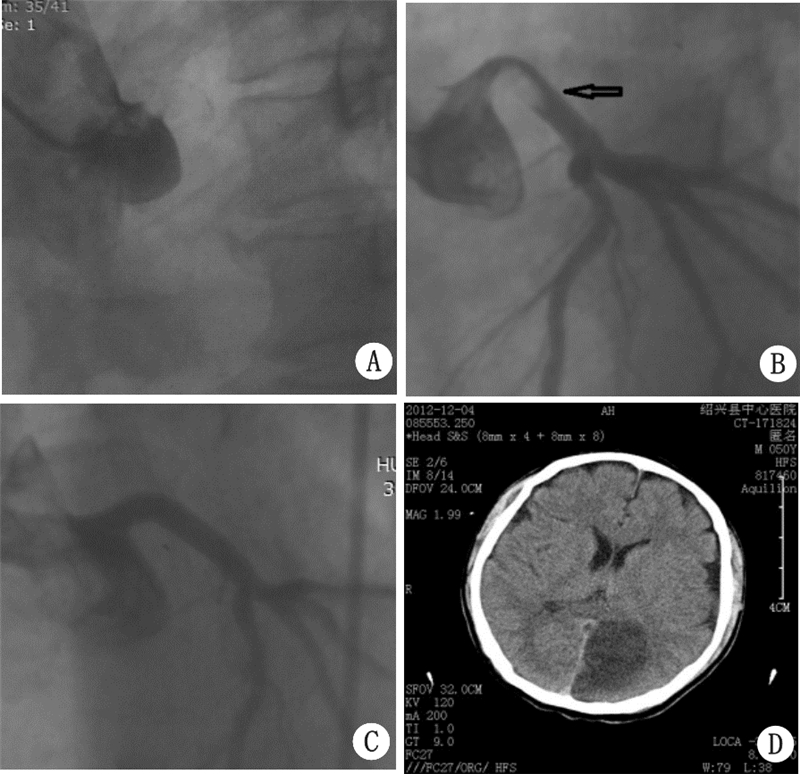 患者男性,50岁,因“胸痛2 h”入院于2012年11月30日。2 h前在活动时出现胸前区疼痛,显持续性,伴头晕,出汗,无恶心、呕吐等,急呼120送当地中医院,当时查心电图示急性前壁心肌梗死,予以口服阿司匹林、氢氯吡格雷片各300 mg后,转送本院。有20年喝酒及抽烟史。烟约每日1包,酒每日500 mL。否认有高血压病、糖尿病、心脏病及脑梗死病史,从事体力劳动;否认家属中有类似病史。入院查体:T 35.0 ℃,P 102次/min,R 33次/min,BP 96/58 mmHg(1 mmHg=0.133 kPa),意识尚清,精神软弱,口唇轻度发绀,两肺呼吸音对称,未及干湿性啰音,心率102次/min,律不齐,闻及早搏,约5次/min,未及杂音,腹平软,肝脾肋下未触及,两下肢浮肿阴性,神经系统未见阳性体征。考虑:急性广泛前壁心肌梗死。同家属商量后,决定行急诊PCI术,术中所见:右冠未见明显狭窄,左主干开口后全闭(图 1A),决定行左冠PCI术。顺利通过导丝到前降支远端,重复造影显示左主干开口巨大血栓,送入抽吸导管抽出红色血栓,后重复造影示左主干近端仍见血栓,但血栓随着造影剂返流逸出冠脉口(图 1BC),进入主动脉,冠脉血流恢复通畅,未见明显狭窄,术中出现恶性心律失常,反复除颤16次,并持续胸外按摩近30 min,予以机械呼吸,因血压偏低,术中予以IABP植入,于入院第4天在减少镇静剂用量时,发现有烦躁,查病理征阴性,为排除脑血管意外可能,行头颅CT检查示左顶枕叶脑梗(图 1D)。住院半个月,顺利康复出院。