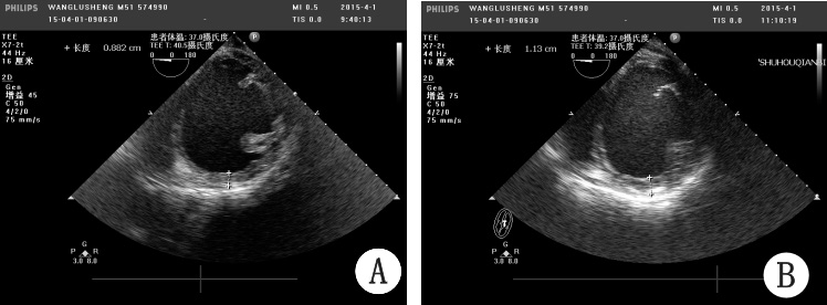 | A:注射前;B:注射后 图 2 患者术中实时心脏超声监控结果 Fig 2 Real-time ultrasonic monitoring |