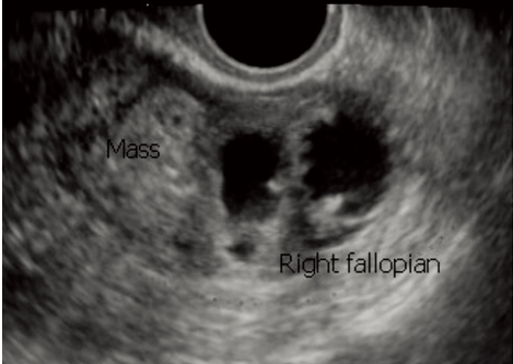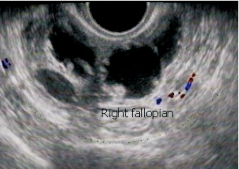 | 图 2 右侧输卵管积水旁中等回声团,彩色多普勒未显示血流信号 |