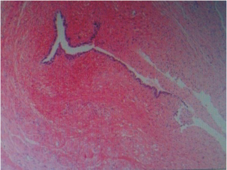 | 图 4 右输卵管管壁出血伴坏死(HE,×10) |
