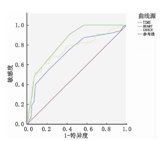 图 3 三种危险评分方法预测急诊胸痛患者MACE事件的ROC曲线图 Fig 3 Comparison of AUROC between the 3 kinds of score in predictive ability