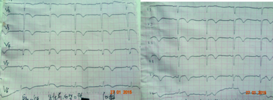 | 图 1 急性前壁心肌梗死的患者术前和术后2 d心电图表现 |