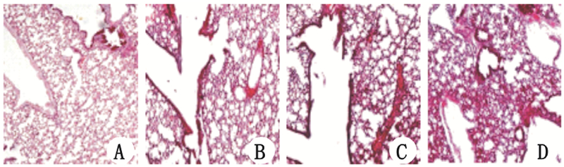 | A:正常对照组;B:脂多糖对照组;C:TRALI组;D:阳性对照组 图 1 各组肺组织病理学改变(HE×200) Fig 1 Pathological changes of lung tissue(HE×200) |