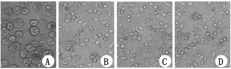 | A:正常对照组;B:脂多糖对照组;C:TRALI组; D:阳性对照组 图 2 AM体外培养生长情况(×200) Fig 2 AM growth in vitro(×200) |