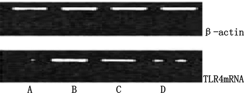 | A:正常对照组;B:阳性对照组;C:TRALI组;D:脂多糖对照组 图 3 TLR4 mRNA表达 Fig 3 Expression of TLR4 mRNA |