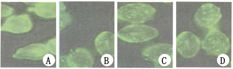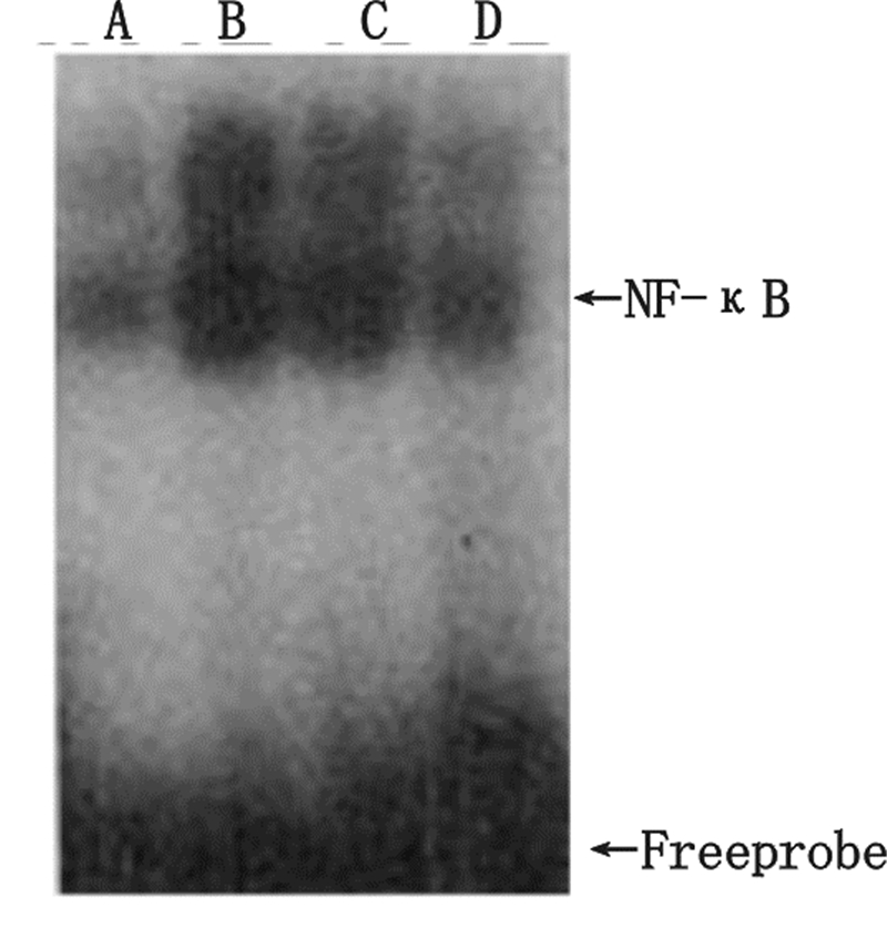 | A:正常对照组;B:阳性对照组;C:TRALI组;D:脂多糖对照组 图 4 AMφ中NF-кB的活性 Fig 4 NF-кB actitition of AMφ |