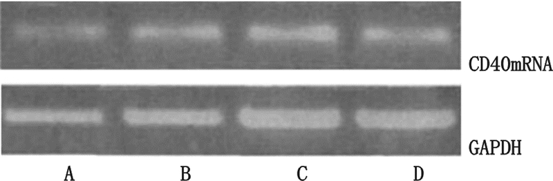 | A:正常对照组;B:TRALI组;C:阳性对照组;D:脂多糖对照组 图 5 CD40 mRNA表达水平 Fig 5 CD40 mRNA expression in different groups |