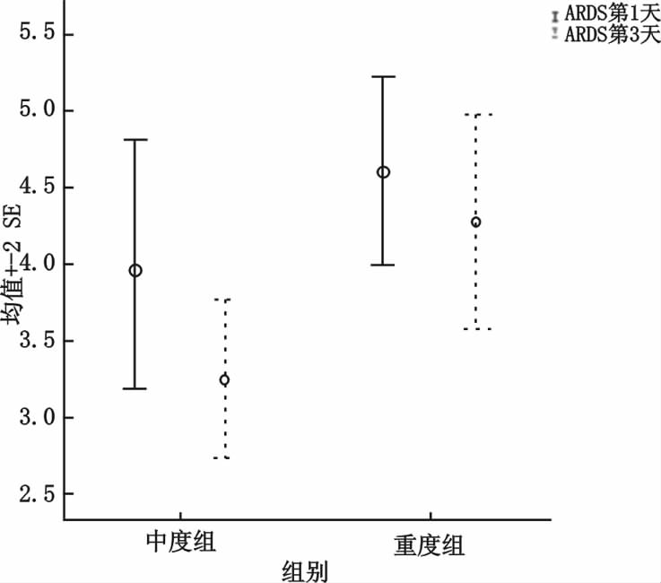 2.3 第1、3天中度组和重度组之间以及存活组和死亡组之间IL-9的比较ARDS确诊第1天,中度组患者外周静脉血清IL-9水平(4.00±1.71) pg/mL与重度组(4.61±0.97) pg/mL相比差异无统计学意义(t=-1.043,P=0.307);第3天中度组患者外周静脉血清IL-9水平(3.26±1.09) pg/mL明显低于重度组(4.27±1.11) pg/mL,差异具有统计学意义(t=-2.337,P=0.027)。见图 1。