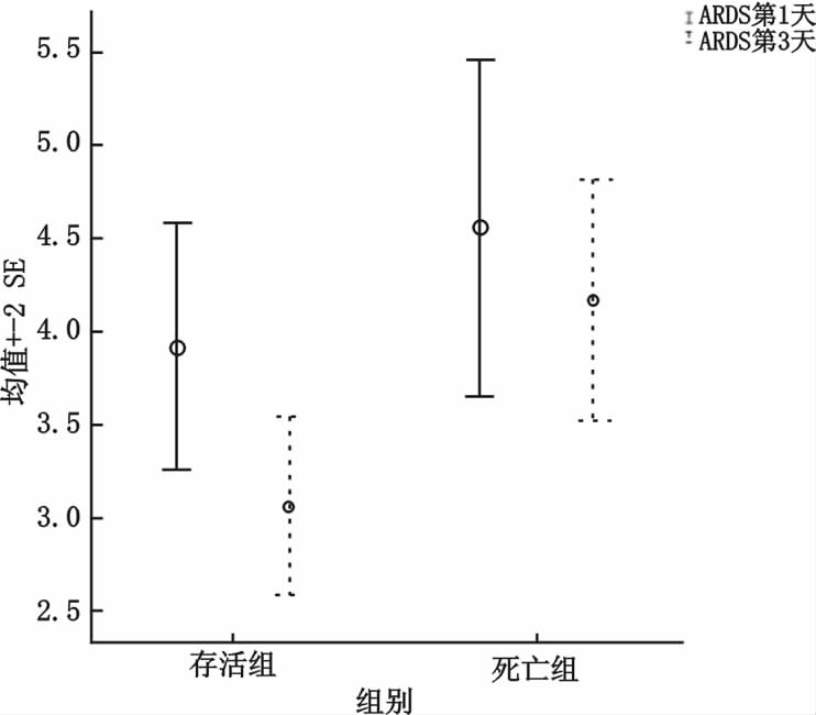 ARDS确诊第1天存活组患者血清IL-9水平(3.88±1.17) pg/mL低于死亡组患者(4.51±1.72) pg/mL,但差异无统计学意义(t=-1.099,P=0.282);第3天存活组患者血清IL-9水平(3.04±0.85) pg/mL明显低于死亡组患者(4.12±1.23) pg/mL,差异具有统计学意义(t=-2.673,P=0.013)。见图 2。
