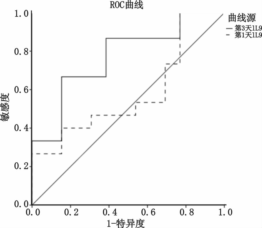 本研究还发现,建立受试者工作特征曲线(ROC曲线)分别对第1天和第3天的IL-9进行ROC曲线分析来预测ARDS患者28 d的病死率,结果显示第1天ROC的AUC为0.579,第3天ROC的AUC为0.769(P<0.05),考虑IL-9在第3天的水平较第1天的降低直接影响着病死率。另其最佳28 d死亡预测值2.88 pg/mL,其灵敏度86.7%,特异度61.5%,相对比较低。考虑与本研究的样本数量较少有关,需要在后续研究扩大样本量[13]。