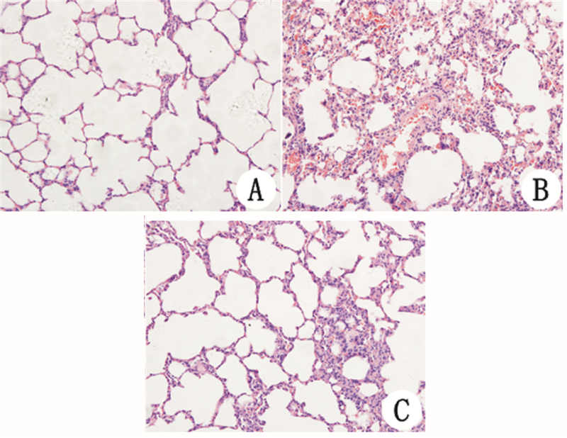 | A: SO组;B: SAP组;C: HRS组 图 1 12 h大鼠肺组织病理改变 (HE×200) Fig 1 Morphologic change of lung tissues at 12h(HE×200) |