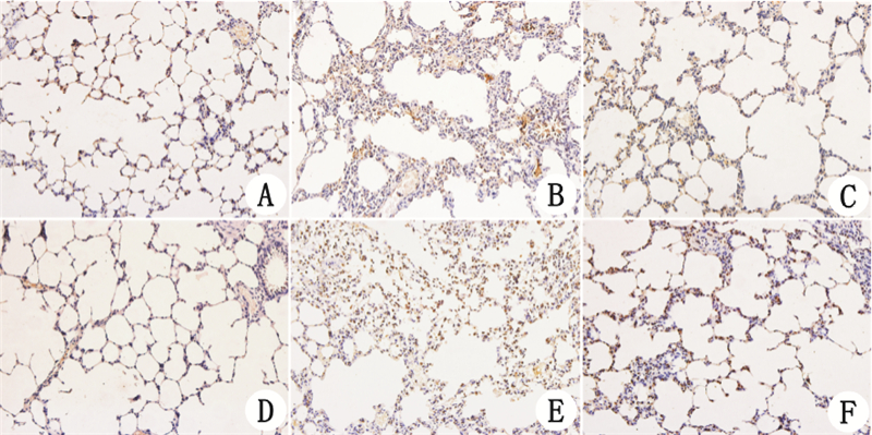 | P38MAPK免疫组化 A: SO组;B: SAP组;C: HRS组 p-P38MAPK免疫组化 D: SO组;E: SAP组;F: HRS组 图 2 12 h大鼠肺组织P38MAPK及p-P38MAPK免疫组化(×200) Fig 2 Immunohistochemistry detection of the expression of P38MAPK and p-P38MAPK in lung tissues at 12h(×200) |