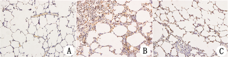 | A: SO组;B: SAP组;C: HRS组 图 3 12 h大鼠肺组织NF-κB P65免疫组化(×200) Fig 3 Immunohistochemistry detection of the expression of NF-κB in lung tissues at 12h(×200) |