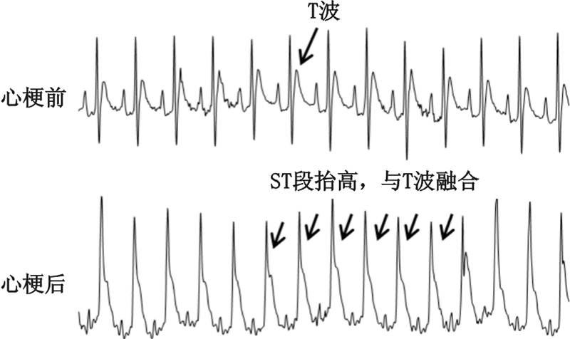 | 图 1 心梗前后Ⅱ导联ECG的变化 Fig.1 Changes in Ⅱ lead ECG before and after myocardial infarction |