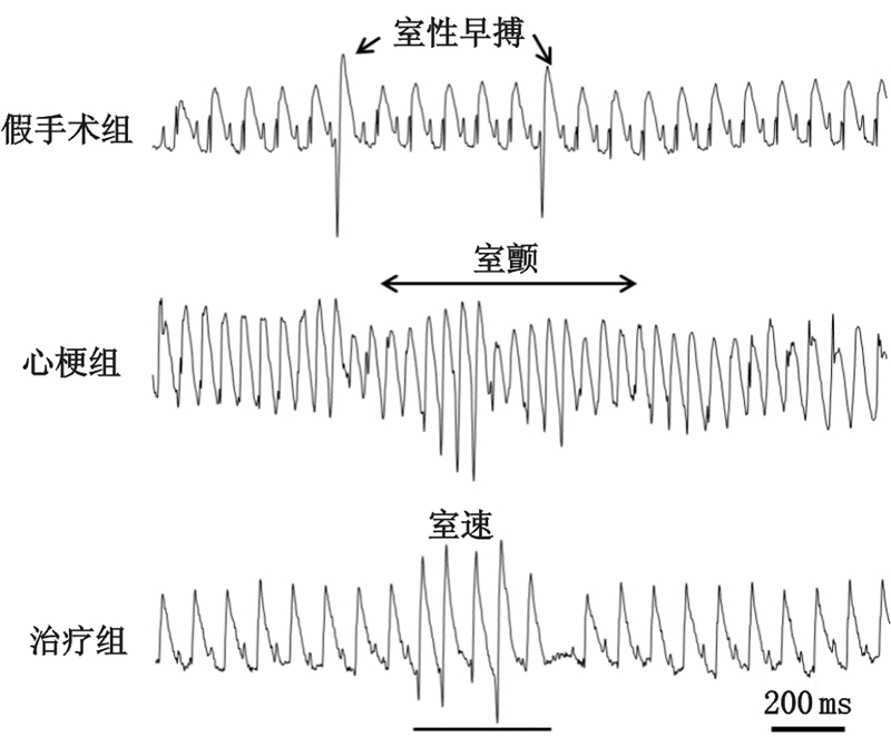 | 图 2 三组大鼠急性心梗后典型的室性心律失常表现 Fig.2 Typical VAs after myocardial infarction among three groups |