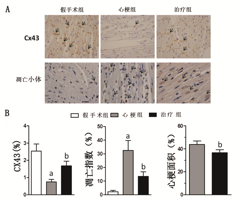 1.4 病理学分析在心电图记录24 h后,迅速脱臼处死动物,取出心脏,分离左心室 (每组随机4只)。经过10%福尔马林固定、石蜡包埋、切片等步骤将标本切除5 μm的组织,将切片分为两份。一份予抗缝隙连接蛋白43(connexin43,Cx43)抗体(1∶ 500,Abcam公司,美国)孵育和荧光素标记。另一份采用细胞凋亡试剂盒(北京中杉金桥生物技术有限公司),运用末端脱氧核苷酸转移酶介导的缺口末端标记法(terminal deoxynucleotidyl transferase mediated dUTP nick-end-labelling,TUNEL)染色。将切片置于OLYMPUS BX51显微系统下拍摄,每个切片随机拍6张,再运用 Image-Pro Plus 6.0(Media Cybernetics公司,美国)图像分析系统计算阳性的染色组织。Cx43表达量以阳性染色面积除以总面积表示,凋亡指数以凋亡小体个数除以细胞核总个数表示。