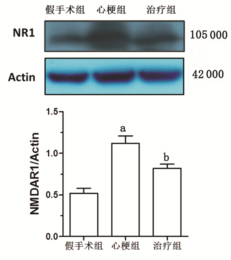 | 与假手术组比较,aP<0.01;与心梗组比较,bP<0.01 图 4 左心室NMDAR1表达量比较 Fig.4 Comparison of the NMDAR1 expression in left ventricle |
