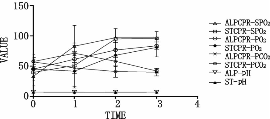 | 注:ALP-CPR 腹部提压心肺复苏;STD-CPR 标准心肺复苏;P 呼吸;MAP 平均动脉压;pH 血液酸碱度;SPO2 血氧饱和度;PO2 氧分压;PCO2 二氧化碳分压;LAC 乳酸 | ||||