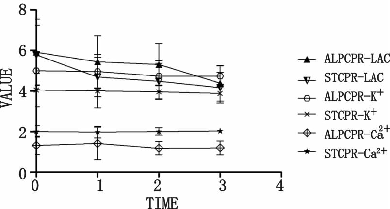 | 图 2 两组患者LAC、K+、Ca2+变化趋势 |