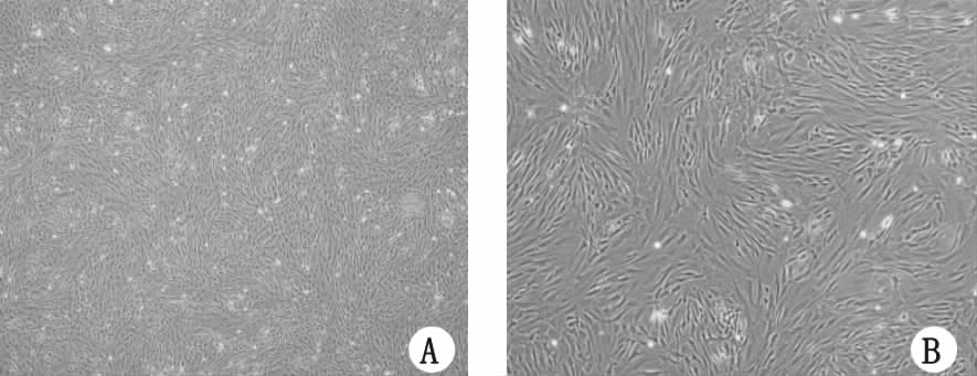 A:第3代MSCs(5d×40);B:第3代MSCs(2d×100) 图 1 骨髓间充质干细胞形态 Fig 1 Morphology of mesenchymal stem cells