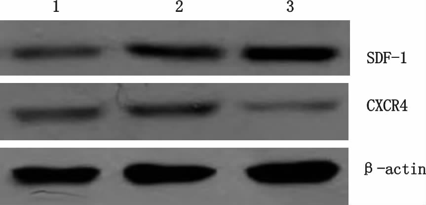 1:MSCs组;2:MSCs+匀浆组;3:MSCs+匀浆+CXCR4抗体组。SDF-1α蛋白:在匀浆组和CXCR4抗体组显著升高,但2组间差异无统计学意义;CXCR4蛋白:匀浆组显著升高,CXCR4抗体组明显下降 图 3 Western blot 检测MSCs SDF-1α和CXCR4蛋白表达 Fig 3 SDF-1α and CXCR4 protein expression in three groups by western blot