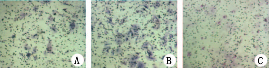 A:MSCs组迁移细胞;B:MSCs+匀浆组迁移细胞明显增加;C:MSCs+匀浆+CXCR4抗体组迁移细胞显著减少 图 4 Transwell实验计数各组迁移细胞数(荧光显微镜 ×200) Fig 4 Evaluation of MSC migration in three groups by transwell test(×200)
