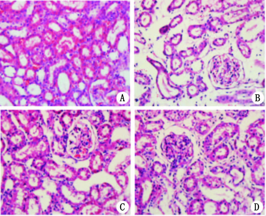 A:正常组;B:I/R组;C:I/R+MSCs组;D:I/R+MSCs+CXCR4抗体组 图 5 3 d时各组大鼠肾组织病理改变(HE×200) Fig 5 Observation of renal pathological changes at three days by HE staining(HE×200)