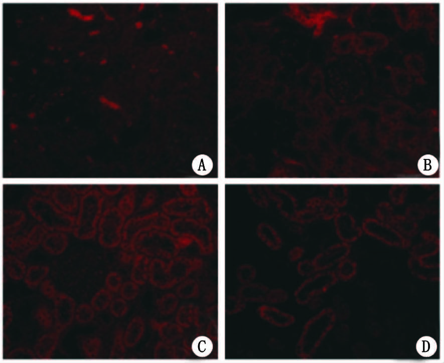 A:正常组;B:I/R组CXCR4蛋白表达增多;C:I/R+MSCs组CXCR4蛋白表达明显增加;D:I/R+MSCs+CXCR4抗体组CXCR4蛋白表达显著下调 图 6 3 d时各组大鼠肾皮质CXCR4蛋白表达(免疫荧光×200) Fig 6 Renal cortical CXCR4 protein expression at three days by immunofluorescence histochemistry(×200)