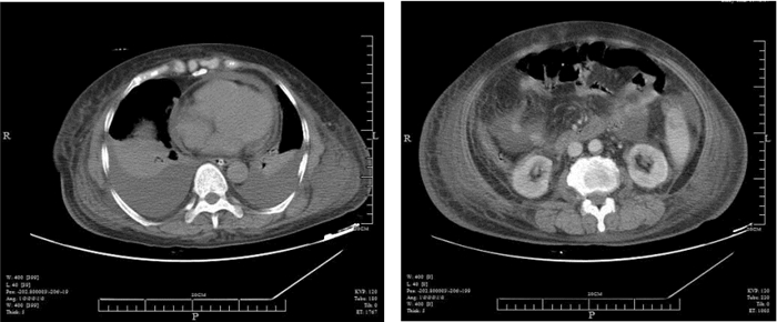| 图 1 治疗前CT:A 胸腔积液,B 心包积液,腹腔盆腔积液 |