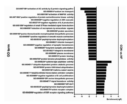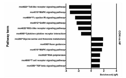 2.2 差异表达miRNA 靶基因显著富集的 GO和Pathway靶基因 GO 显著性分析显示,HF组差异表达miRNA的靶基因主要富集于31个GO。其中12个GO被上调miRNA的靶基因调控,富集度最高的GO主要涉及泛素-蛋白酶体系统(GO:0006511、GO:0008234、GO:0070936);19个GO被下调miRNA的靶基因调控,主要涉及G蛋白相关激酶激活(GO:0007189)、钠离子转运(GO:0006814)及MAPK激酶激活(GO:0000186)等,P<0.01,见图 1。