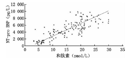 CHF组患者的NT-Pro BNP水平与NYHA分级呈正相关(r=0.956,P<0.01);和肽素含量也与NYHA分级呈正相关(r=0.855,P<0.01)。同时,和肽素含量与NT-Pro BNP呈正相关(r=0.804,P<0.01,图 1)。