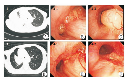 图 1 A:术前胸部CT示,右肺肿块伴阻塞性肺炎,右主支气管几乎完全闭塞,左主支气管尚存狭小缝隙。图B:术前气管镜(隆突)示,右主支气管腔内新生物,隆突累及,右主管腔基本堵塞,左主可见新生物。图C:术前气管镜(左主支气管)示,左主支气管腔内新生物,左主支气管管腔明显狭窄。图D:术后胸部CT示,左主支气管狭窄较前明显好转。图E:术后气管镜(隆突),右主支气管仍几乎完全堵塞,左主支气管通畅。 图F:术后气管镜(左主支气管)示,左主支气管通畅,内侧壁新生物伴局部凹陷。